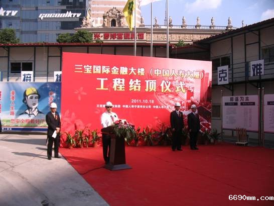 宁波三宝项目部代表公司于2011年7月15日与业主签订抢工协议,约定10月15日完成主楼结顶,业主奖励公司30万元。在公司相关部门、业主、监理、总包单位的配合支持下,特别是汉德邦的楼层板的密切配合,我司项目部全体管理人员和施工队工人经过近三个月的共同努力,于10月13日提前两天完成抢工协议约定的工程量内容并于10月18日在现场如期举行工程封顶仪式。